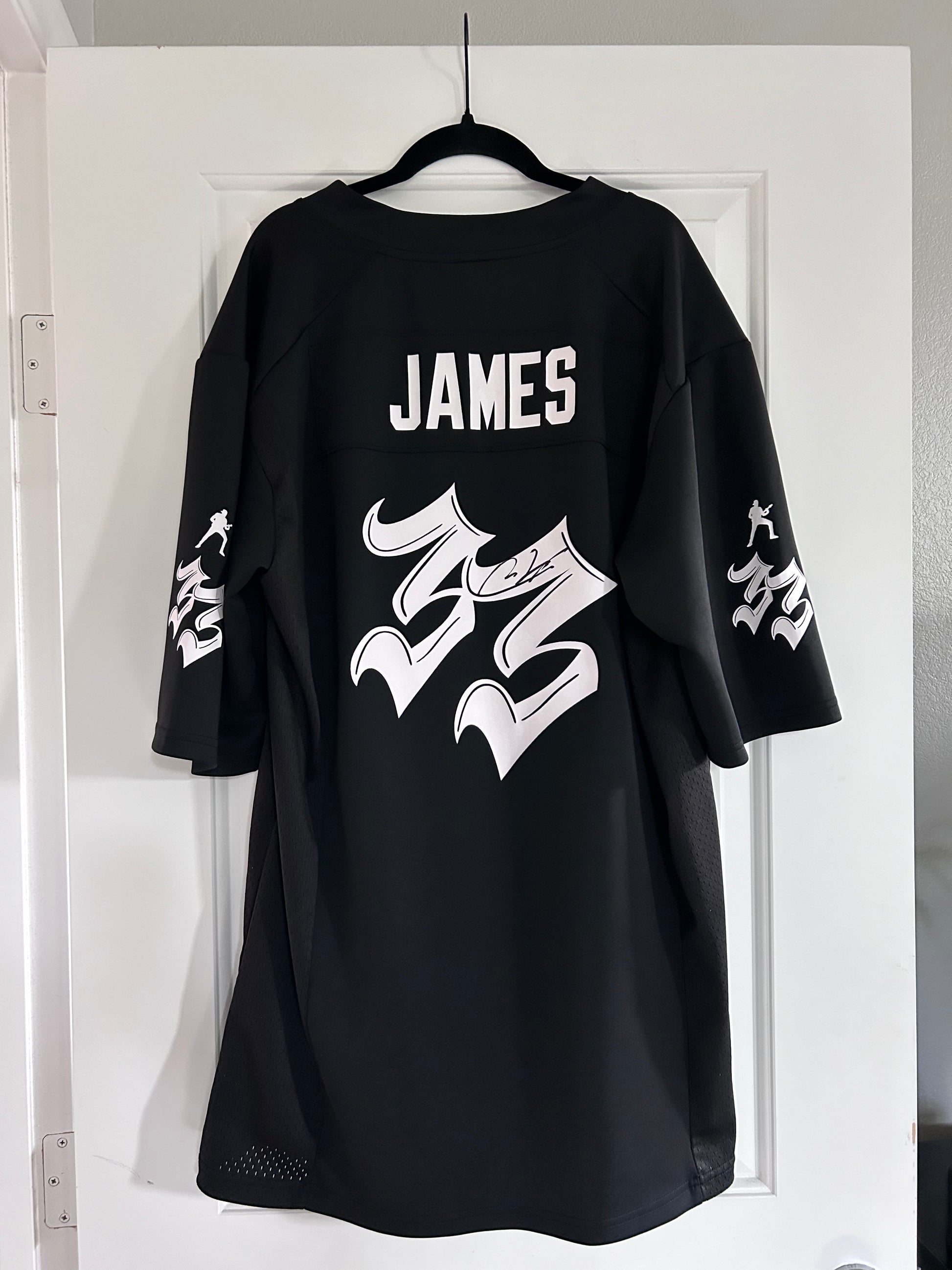 This particular jersey is black with a white 33 number on the front and back. White JAMES surname written on the back.