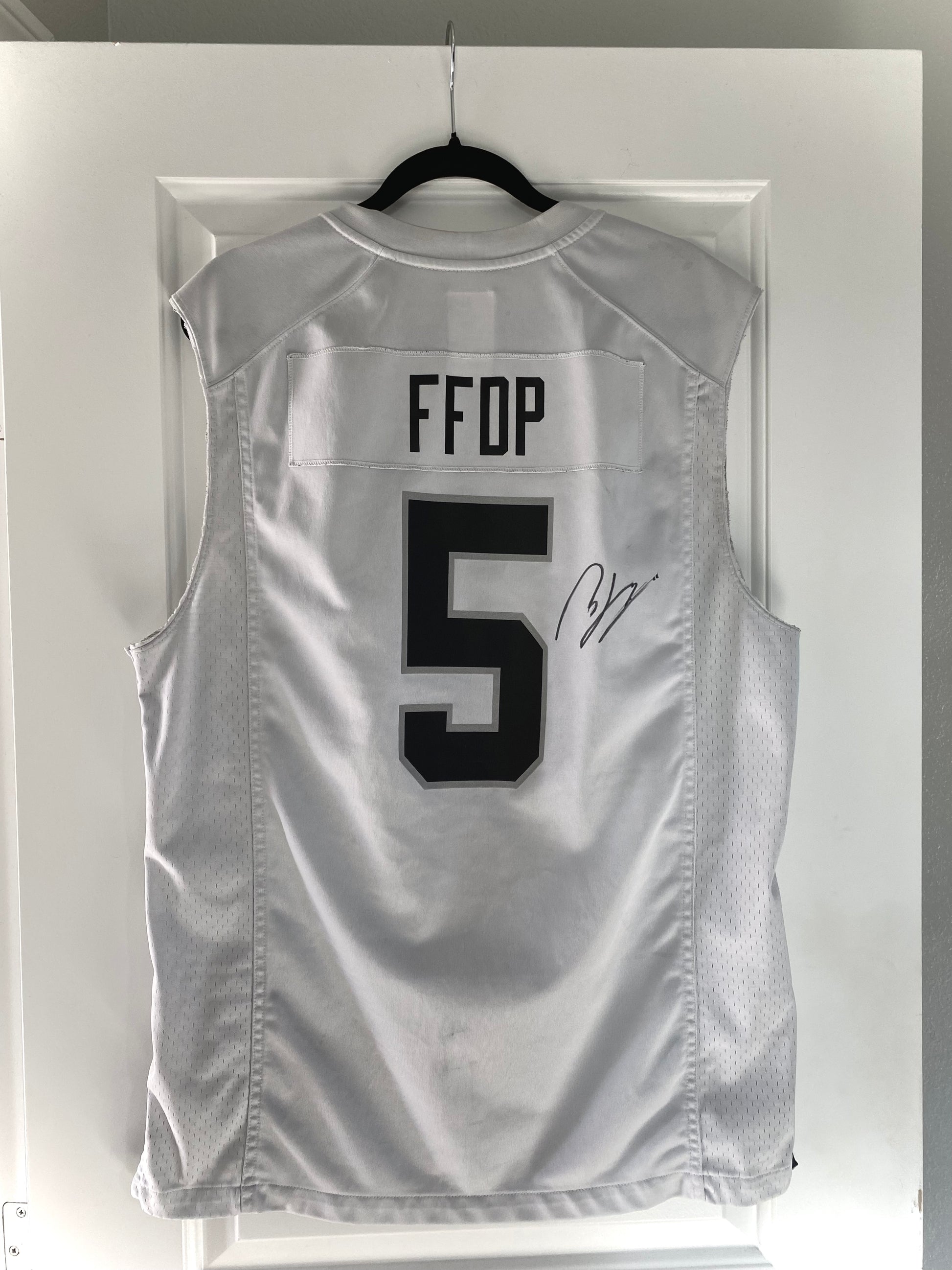 This particular jersey is white with black FFDP 5 writing. Size Large. NFL made.