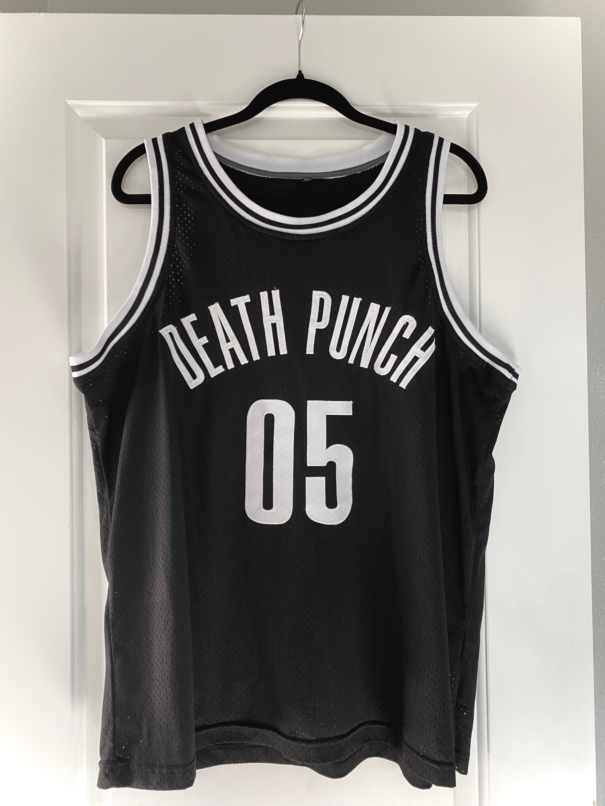 This particular vest/jersey is black with white DEATH PUNCH 05 JAMES writing. Size XL.